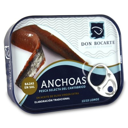 [vedere Cuori di mare di Carril Los Peperetes 30/40 u. (Berberechos)]Acciughe del Cantabrico DON BOCARTE in olio di oliva, basse in sale (85 gr - 13/15 filetti)